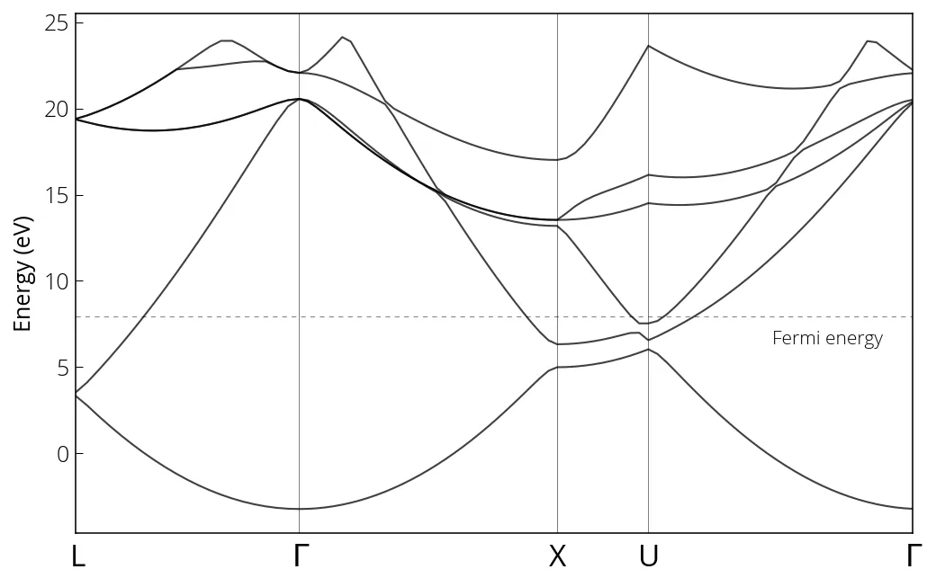 Note from our al_nscf.out that our Fermi energy is at 7.9421 eV. We plot our