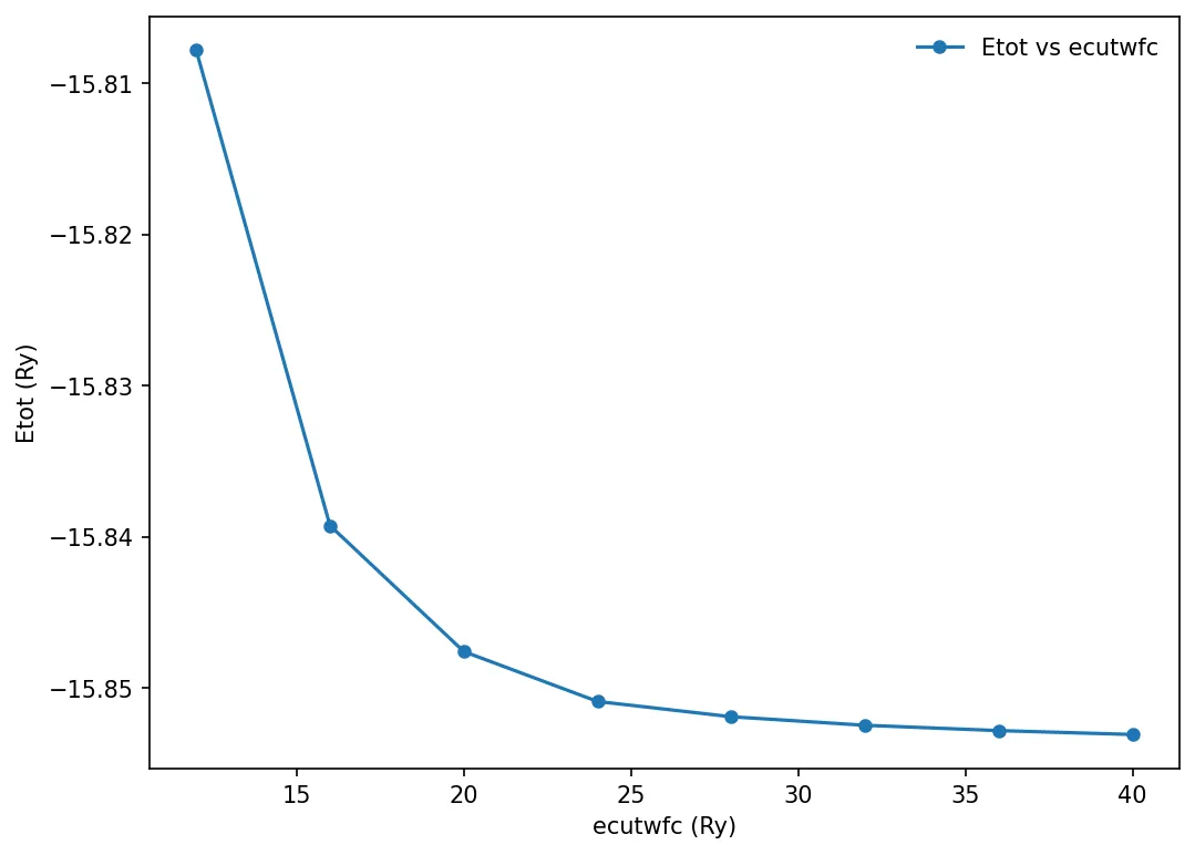 values of ecutwfc. Make a loop varying ecufwfc from 12 until 40 in steps of 4 and run the simulation for each value.