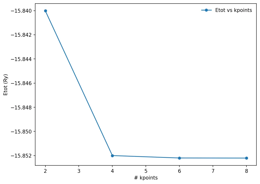 We can run similar convergence test against another parameter, and choose the best value of that particular parameter. Here we will try to calculate the number of k-points in the Monkhorst-Pack mesh.
