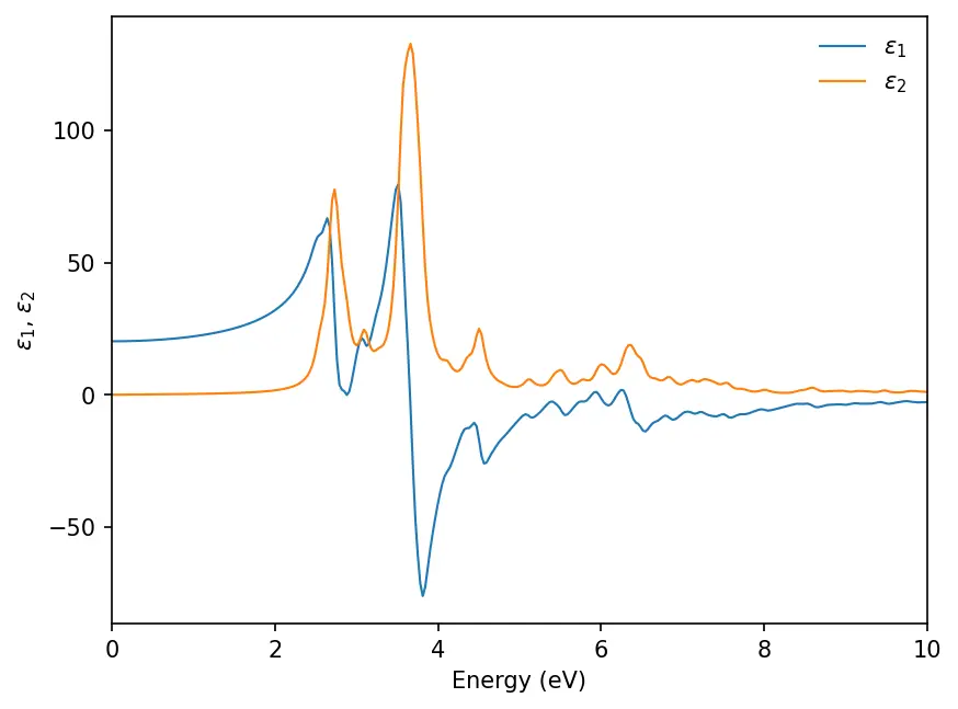 We will see the results are saved in separate .dat files. We can plot the real (ϵ1\epsilon_1) and imaginary (ϵ2\epsilon_2) parts of dielectric constants: