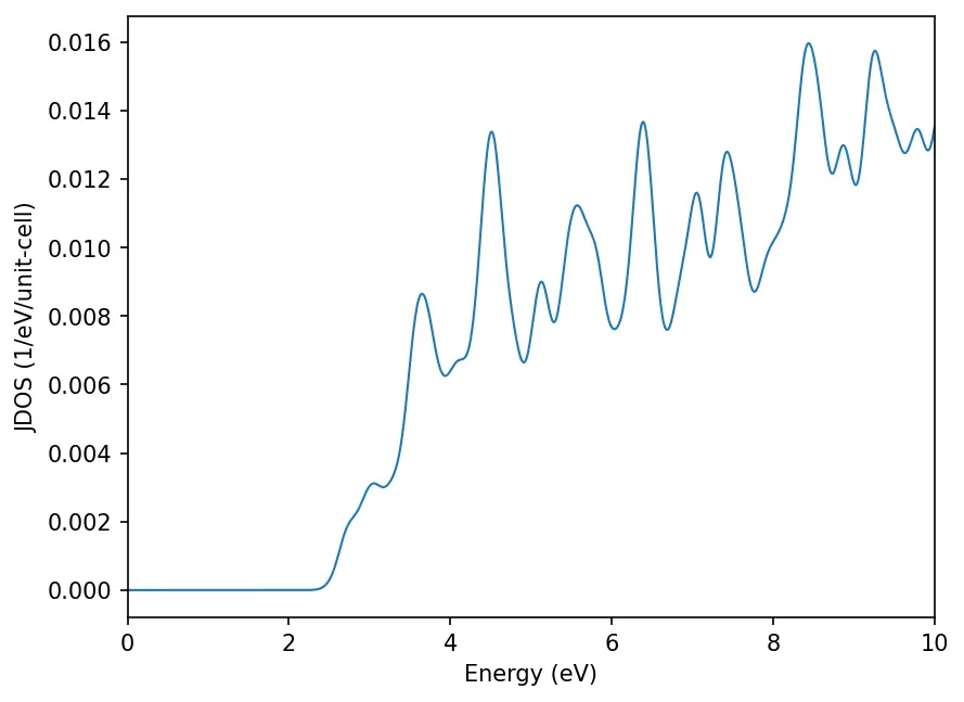JDOS gives the number of states for a pair of initial and final states as a function of frequency (in eV). A larger intensity indicates a larger absorption in the absorption spectra. Input file for JDOS calculation: